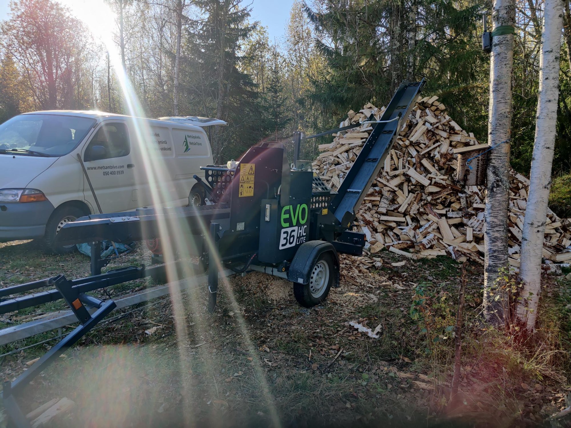 Puiden pilkkominen ajoneuvon perässä vedettävällä Pilkemaster Evo-36 pilkekoneella, päivässä vuoden polttopuut!